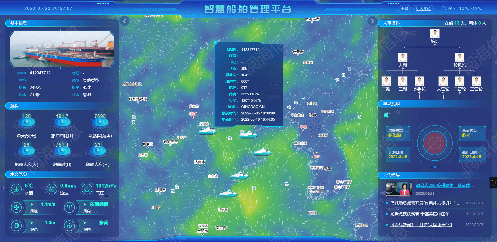 自主研发智慧船舶管理平台,实现人员管理、机务海务、气象资料、预测预警、辅助决策等功能。